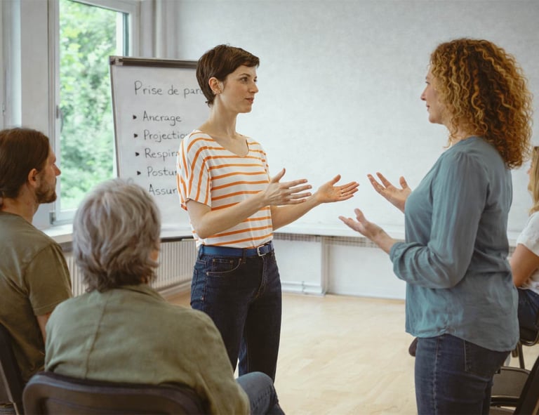 Des ateliers collectifs ponctuels autour de la voix parlée, de la posture et de la présence.